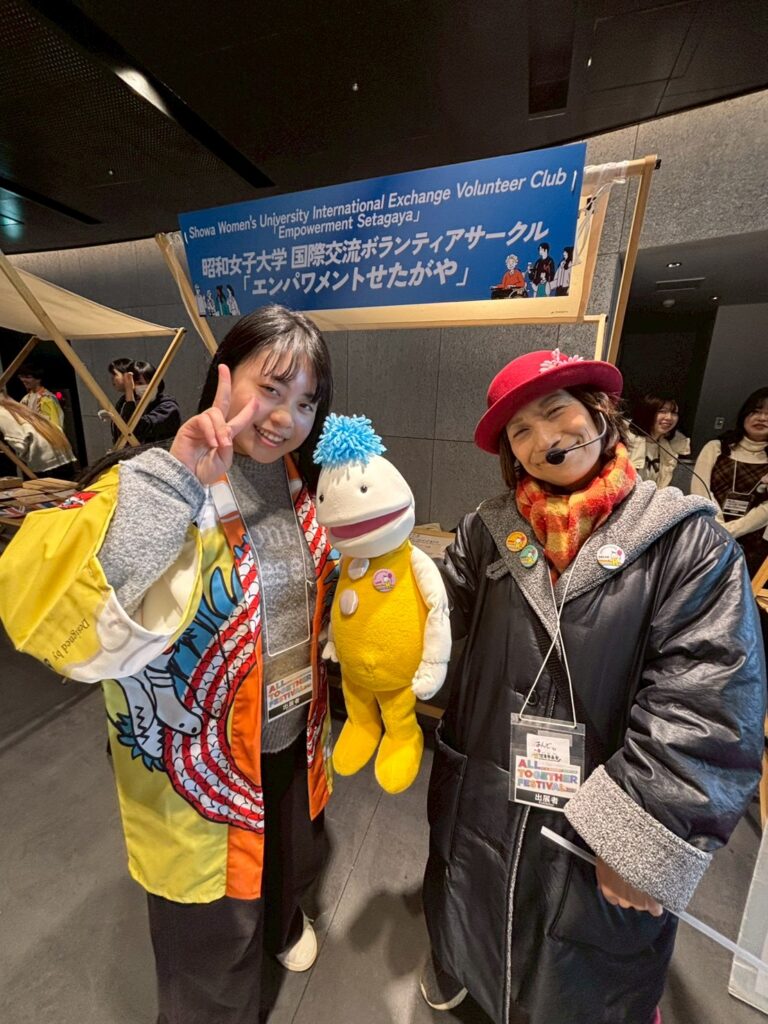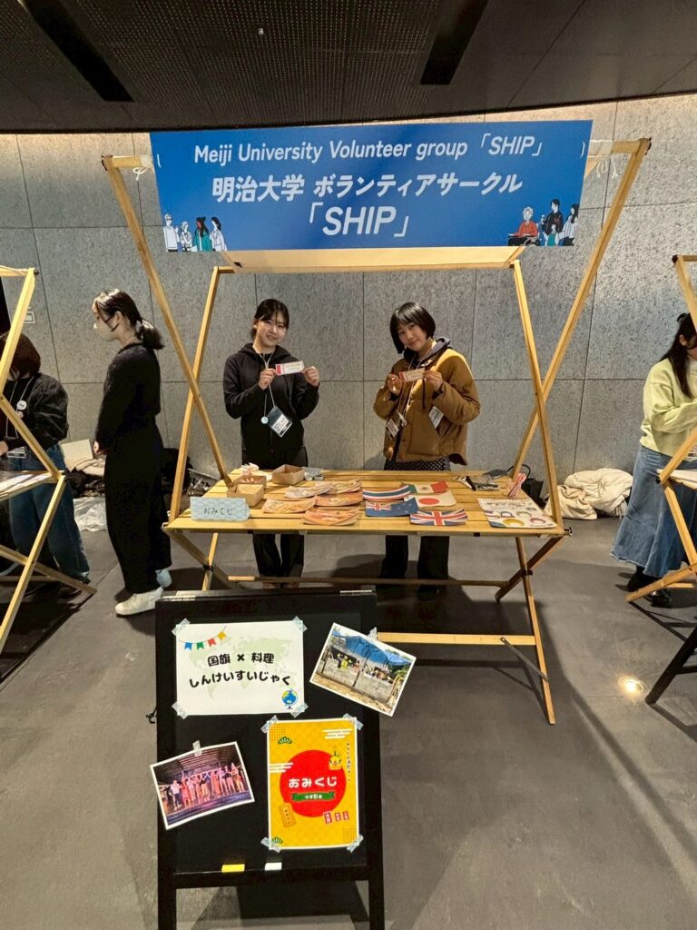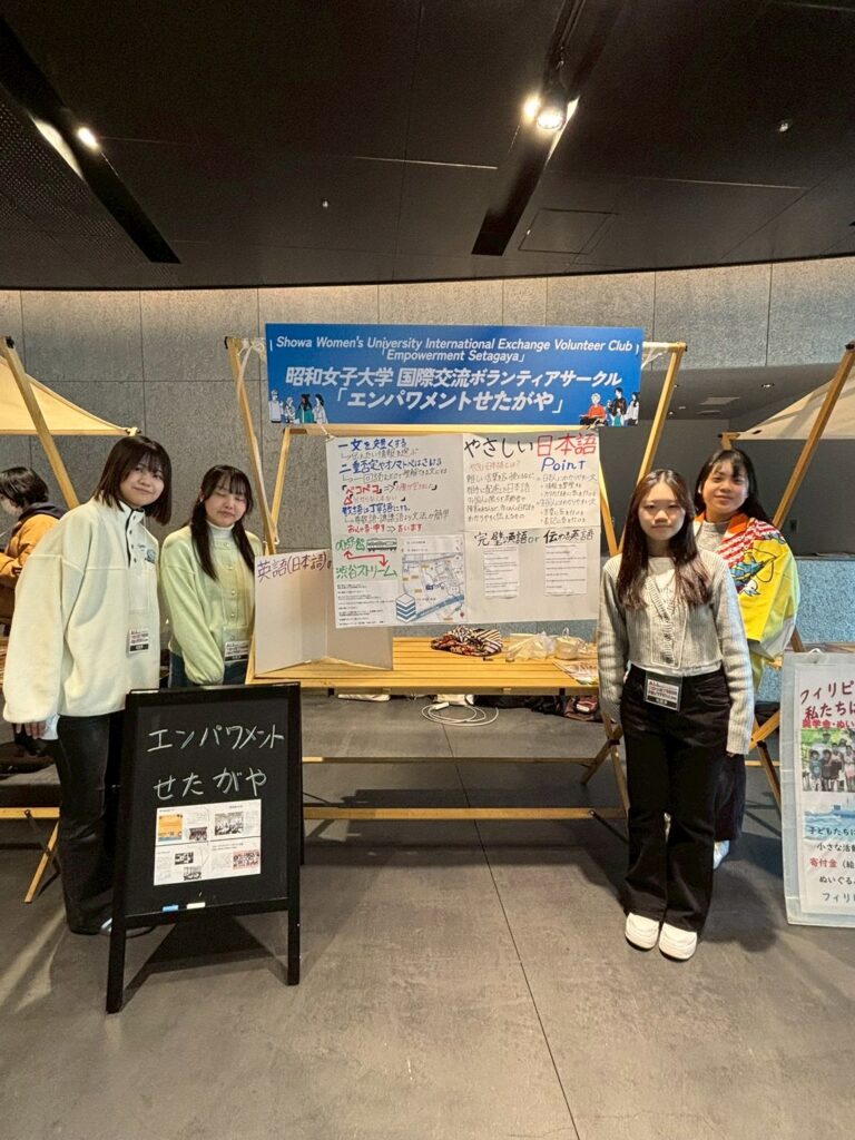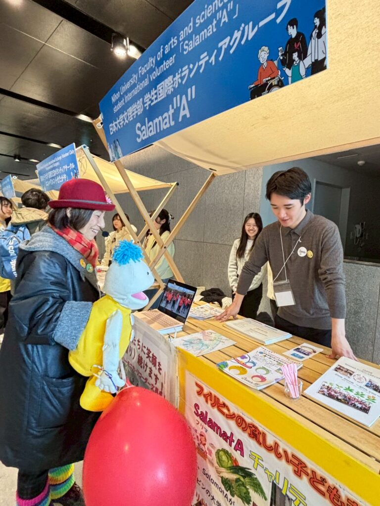 4階展示ブースに参加した国際ボランティア活動紹介には4大学(5団体)が出展し個性を活かした発表に足を止め聞き入る来場者の姿が多数ありました。